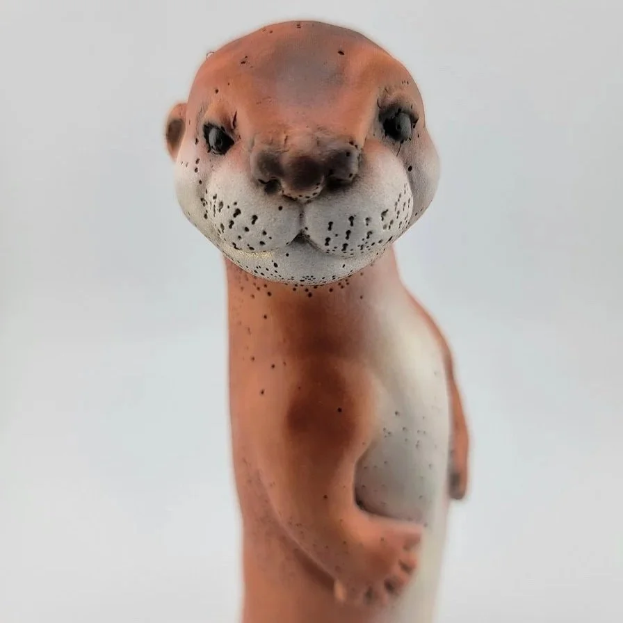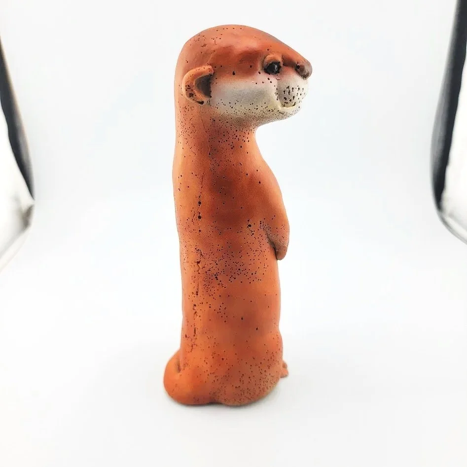 A ginger cat standing next to a white figurine of a man holding pistols, placed on a white oval base.